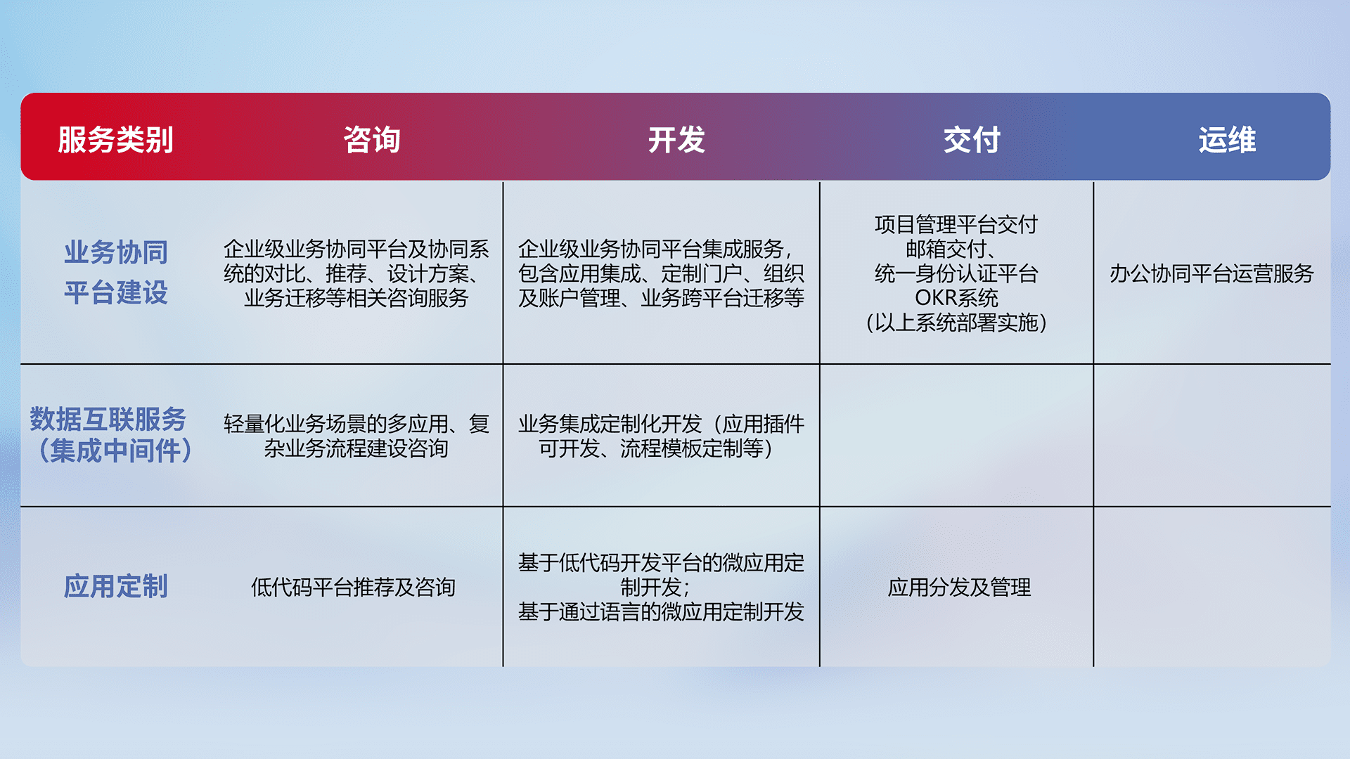 针对钉钉、、、企微、、IDaas等平台级产品提供产品的规划、、方案、、交付、、定制化开发等服务,,,,实现如统一协同办公、、智能客户服务、、、混合会议管理、、、、智能数据查询、、、等业务场景,,,,实现数字化转型。。。